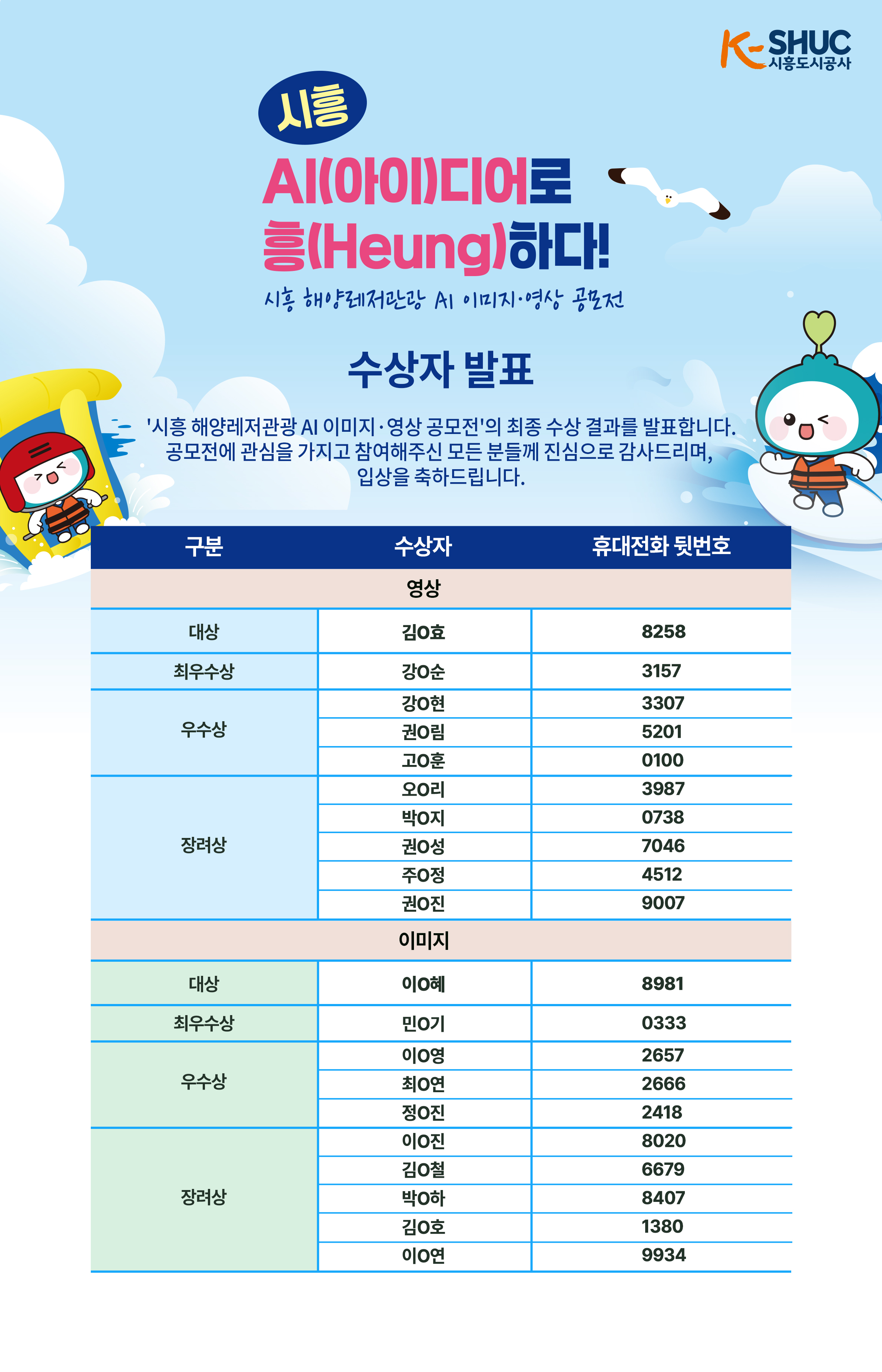 이번 공모전에 참여해주신 모든 참가자 여러분께 진심으로 감사의 말씀을 드립니다.심사위원단의 공정하고 면밀한 심사 끝에, 아래와 같이 최종 수상자를 선정하였음을 발표합니다.